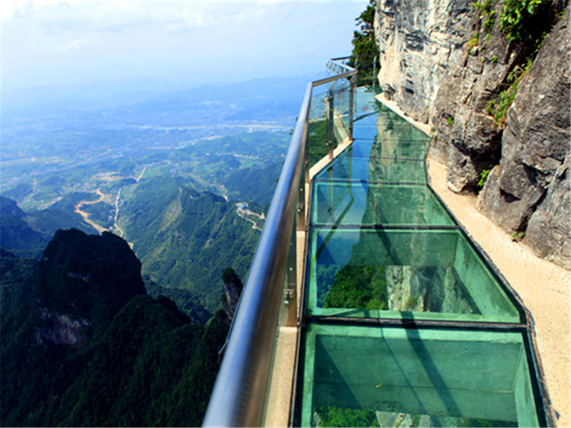 羅田天堂寨景區(qū)地處大別山主峰所在地,因其雄、奇、險、秀,獨(dú)特的山岳風(fēng)光聞名于世。棧道建設(shè)歷時一年,棧道寬1.8米,全長70米,路面采用 三層鋼化夾膠防彈玻璃,每平方可承重600公斤。此處地勢險要,上下臨空,視野開闊,上看一線天瀑布、哲人峰、下俯天堂大峽谷,猴谷,吊橋河村落,位于海 潑1080米小華山一線天懸空崖壁處。